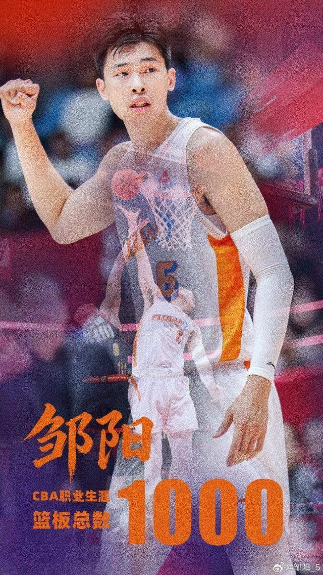 此战之后,邹阳CBA生涯篮板数达到1000个,赛后他也发博庆祝。