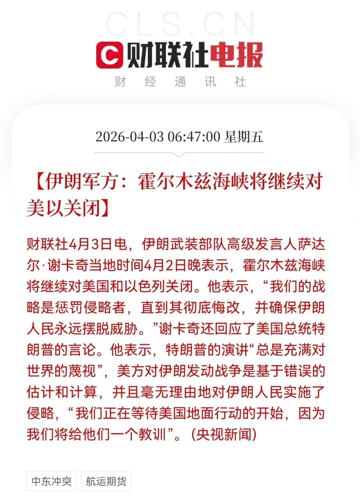 伊朗武装部队高级发言人萨达尔·谢卡奇当地时间4月2日晚表示,霍尔木兹海峡将继续对美国和以色列关闭。